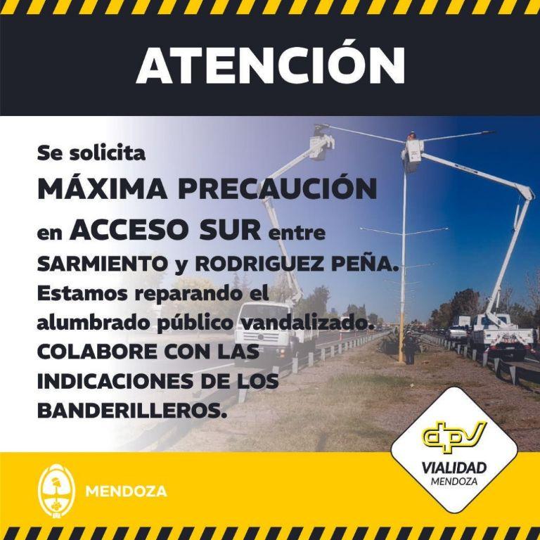 Luminarias Acceso Sur. La Dirección Provincial de Vialidad (DPV) solicitó a los conductores transitar con máxima precaución por el Acceso Sur, en el tramo comprendido entre las calles Sarmiento y Rodríguez Peña, ya que personal del organismo se encuentra trabajando en la reparación de luminarias.