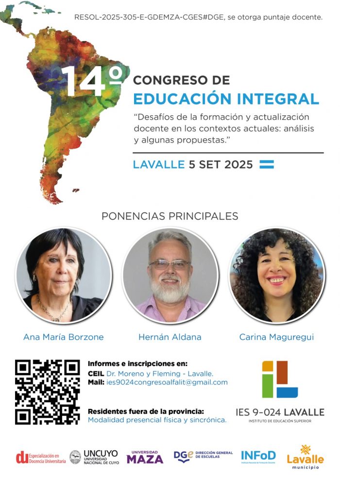 14° Congreso de Educación Integral. El 5 de septiembre en Lavalle los profesionales de la educación podrán participar de este espacio de intercambio y construcción de saberes para reflexionar sobre el sistema educativo y sus características actuales. La jornada tendrá como tema central los desafíos de la formación y actualización docente en los contextos actuales generando un análisis y algunas propuestas. Inscripciones aquí.