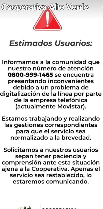 La Cooperativa Alto Verde y Algarrobo Grande informa a la comunidad inconvenientes con el número de atención telefónica: