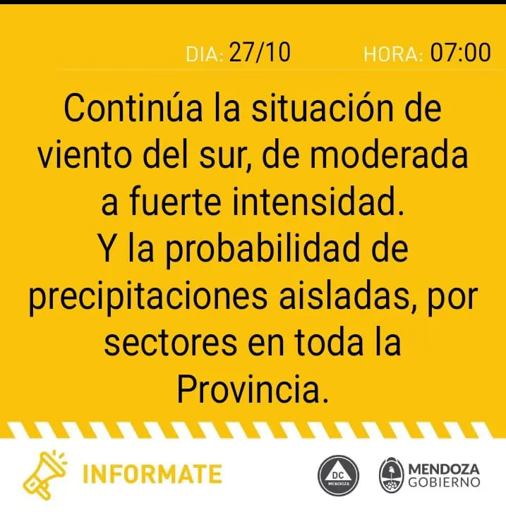 Alerta meteorológica. El Servicio Meteorológico Nacional emitió una alerta amarilla por viento del sur que afectará algunos departamentos en el inicio de la semana. Desde Defensa Civil recordaron que hay probabilidad de precipitaciones aisladas por sectores en toda la provincia.