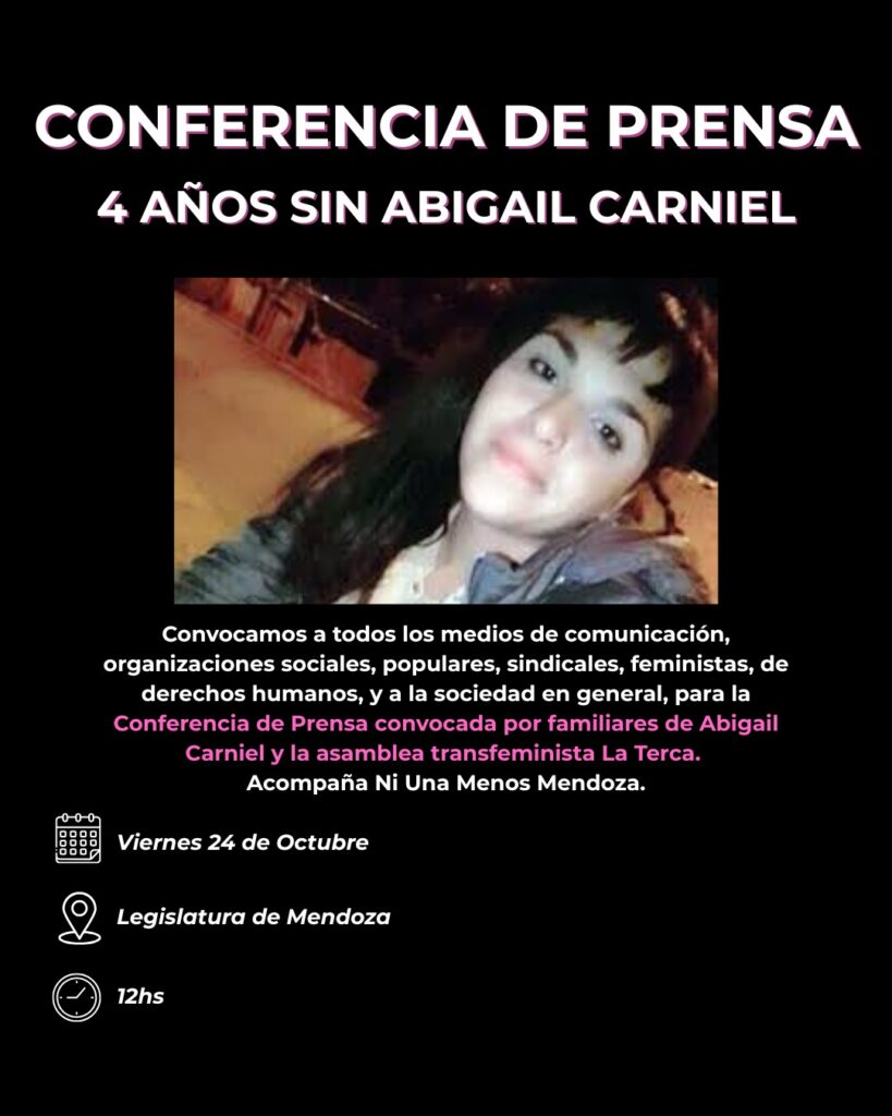 El próximo viernes 24 de octubre a las 12 hs convocamos a todos los medios de comunicación, organizaciones sociales, populares, sindicales, feministas, de derechos humanos, y a la sociedad en general, para la Conferencia de Prensa convocada por familiares de Abigail Carniel, la asamblea transfeminista La Terca y el acompañamiento de Ni Una Menos Mendoza. La actividad se realizará en las puertas de la Legislatura de la Provincia de Mendoza (Peatonal Sarmiento y Patricias Mendocinas, Ciudad).