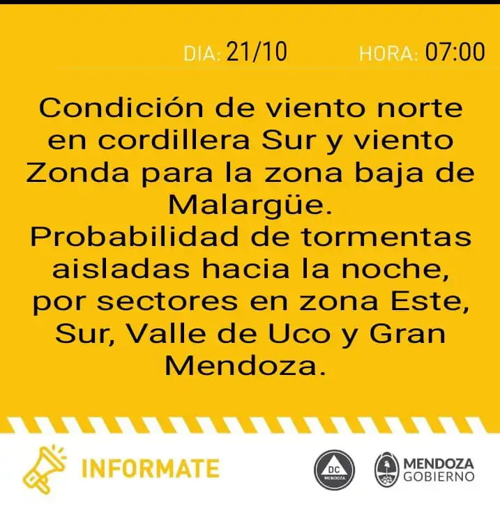 Alerta amarilla. El Servicio Meteorológico Nacional emitió una alerta amarilla por tormentas con posible caída de granizo que afectará gran parte del territorio provincial y viento Zonda en algunos sectores.