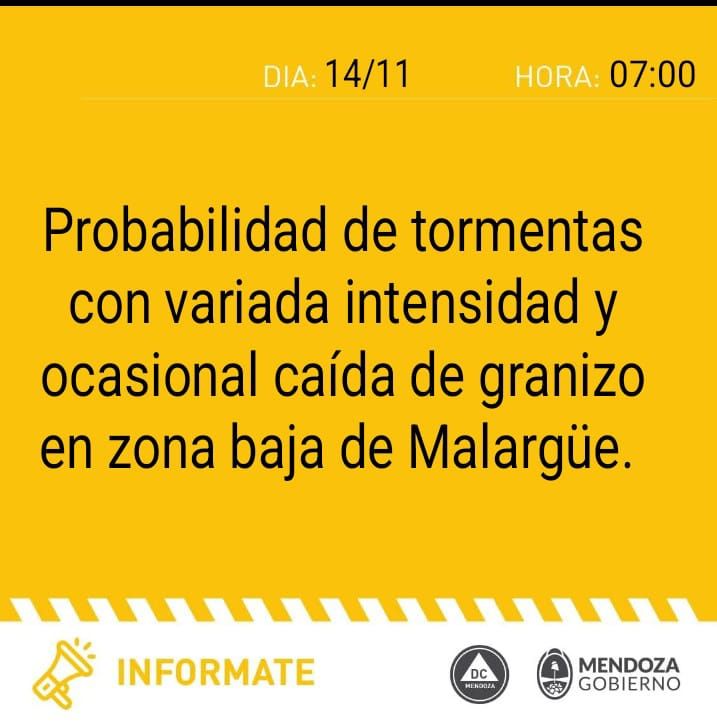 En Capital, Godoy Cruz, Guaymallén, Maipú y Malargüe rige un alerta amarillo, con tormentas aisladas que también pueden presentarse con granizo ocasional, lluvias abundant