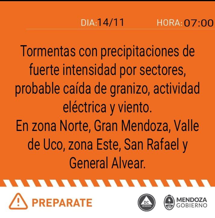 Tiempo en Mendoza. El Servicio Meteorológico Nacional activó un sistema de advertencias que abarca casi toda la provincia ante el avance de tormentas fuertes. Las áreas bajo alerta naranja incluyen Junín, Rivadavia, Luján de Cuyo, Tupungato, Tunuyán, San Carlos, San Rafael, General Alvear, Santa Rosa, La Paz, San Martín, Lavalle y el sector este de Las Heras.
