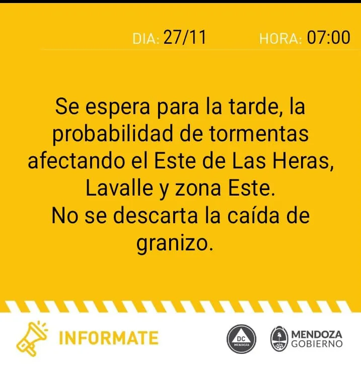 Tiempo en Mza. El Servicio Meteorológico Nacional lanzó una nueva advertencia para Mendoza por tormentas en nivel amarillo, para este jueves. Las zonas afectadas son: Este de Las Heras – La Paz – Lavalle – San Martín – Santa Rosa, para la noche.
