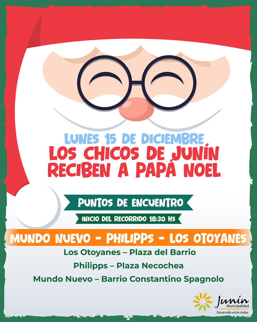 La Municipalidad de Junín informa que, como cada año, Papá Noel recorrerá el departamento para llevar alegría, magia y momentos especiales a grandes y chicos. Cada jornada, la caravana iniciará en la Explanada Municipal, a las 18.30.