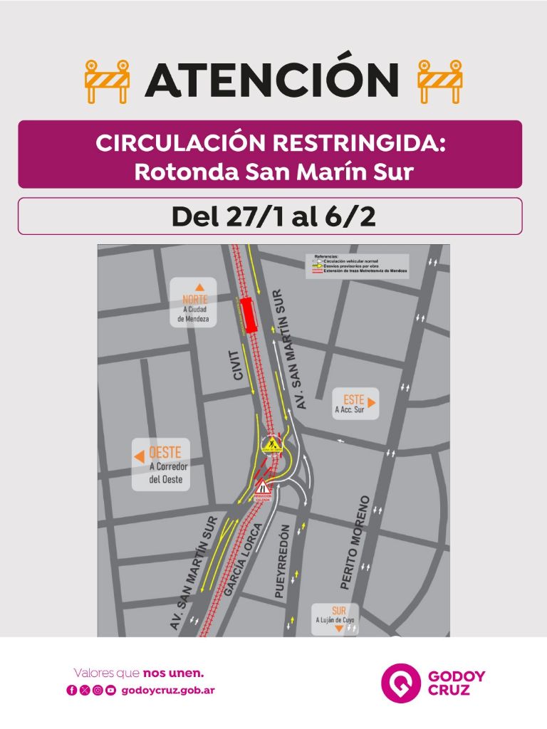 Godoy Cruz. El Municipio informó que, desde este martes 27 de enero, está parcialmente cortada la circulación en la rotonda San Francisco de Asís, por los trabajos que se realizan en la extensión del metrotranvía. Se trata de la calle San Martín Sur, en el tramo que transcurre bajo el puente de la ciclovía. Este desvío se prolongará por diez días, por lo que se solicita a los vecinos especial atención.