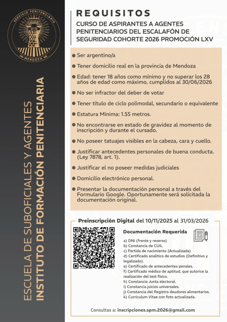 Servicio Penitenciario de Mendoza. Continúa abierta la convocatoria de las pre-inscripciones al “Curso de Aspirantes a Agentes Penitenciarios del Escalafón de Seguridad”. Las mismas se están desarrollando de forma on-line, completando el siguiente formulario digital: https://docs.google.com/forms/d/e/1FAIpQLSfJ5cNL_38tn1RynRalewDEmkjWoZtQHSk5UDYdW1ZZi2N6A/viewform?usp=publish-editor o escaneando el código QR, de la publicación.