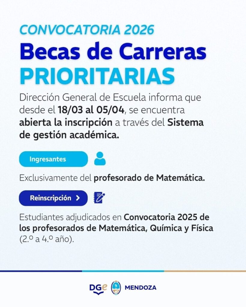 Becas Prioritarias 2026. Las becas están destinadas, a estudiantes ingresantes 2026 al 1° año del Profesorado de Matemática; y a alumnos que ya fueron adjudicados en la convocatoria 2025, quienes podrán renovar el beneficio para continuar sus trayectorias en los profesorados de Matemática, Química y Física, desde 2° hasta 4° año. La inscripción se puede realizar de manera online a través del sistema de Gestión Académica de la DES, y los interesados pueden acercarse a su Instituto de Educación Superior para recibir asesoramiento y acompañamiento durante el proceso.