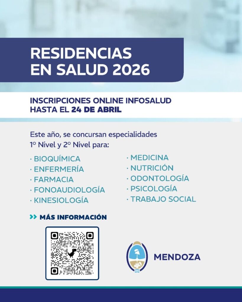 Residencias 2026. Los interesados podrán inscribirse hasta el 24 de abril en todas las especialidades y subespecialidades a través de la plataforma Infosalud. Pueden consultar toda la información en el sitio web https://informacionoficial.mendoza.gob.ar/saludydeportes/departamento-de-residencias/